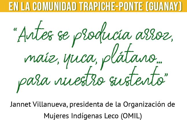 Según las dirigentes, durante generaciones, las comunidades leco han vivido de una producción agrícola diversa que garantizaba el autoconsumo de las familias. Jannet recuerda que en Trapiche-Ponte “antes se producía arroz, maíz, yuca, plátano, frijol, maní… para nuestro sustento familiar”, además, los pobladores “sembraban caña y no compraban azúcar. Ellos lo elaboraban”. En cambio, ahora, el consumo de azúcar blanca industrializada se ha generalizado.