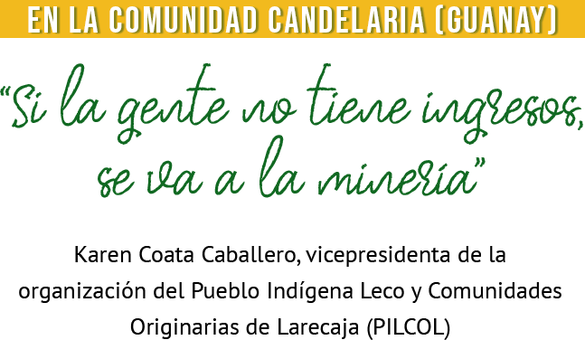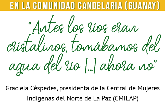 La comunidad leco de Candelaria está asentada sobre el río Mapiri, dentro de la TCO Leco de Larecaja, “más arriba de Guanay”, explica Graciela Céspedes. Allí también viven Rosmery Coata y Karen Coata. En este sector, la mayoría de la población se dedica a la minería. Antes era artesanal y desde hace 10 a 12 años se realiza con maquinaria, cuenta Graciela.