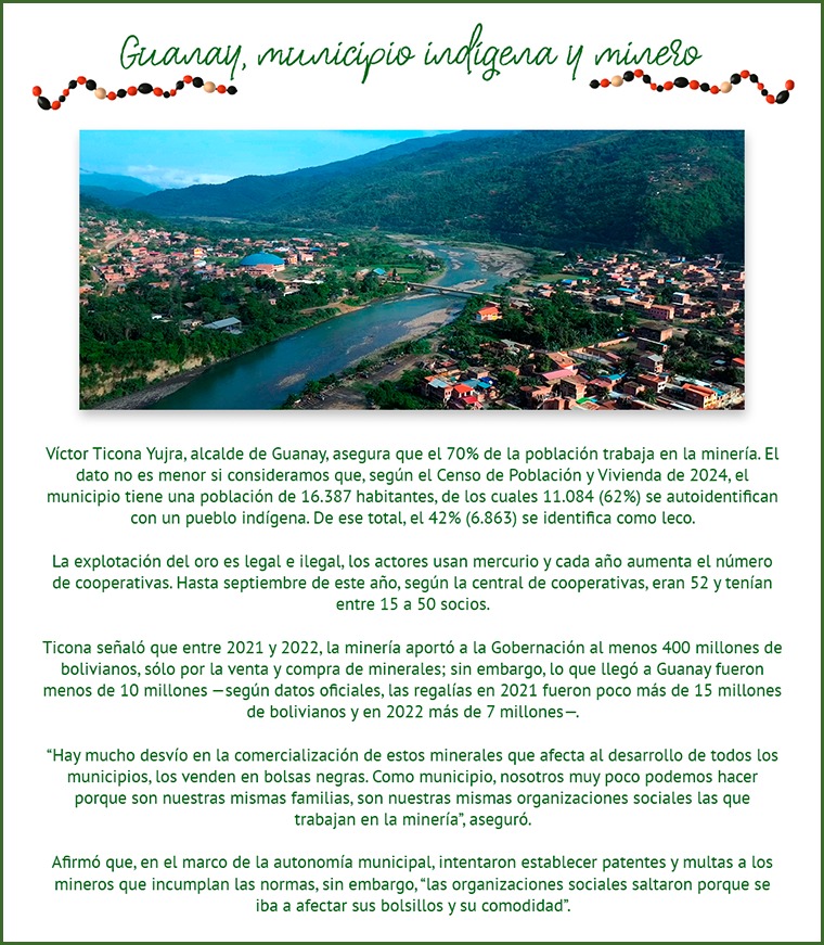 En el norte del departamento de La Paz, en las comunidades indígenas leco asentadas a lo largo de los ríos Mapiri, Tipuani y Coroico, la minería del oro no es un fenómeno nuevo. Lo que durante décadas fue una actividad artesanal, hoy se ha convertido en una actividad de extracción masiva de oro que reorganiza la vida económica, social y territorial de las comunidades indígenas.